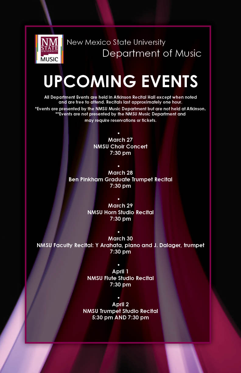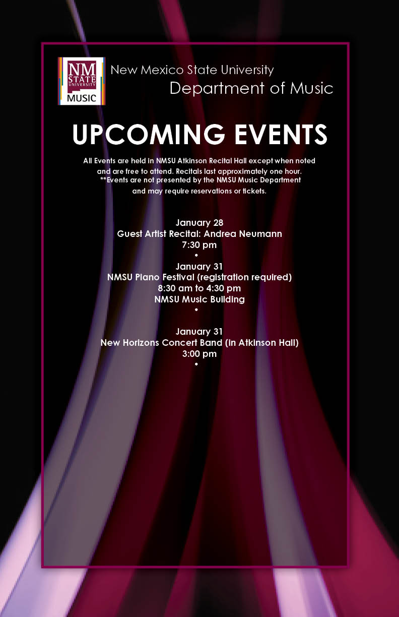 Visit this page for upcoming NMSU Music Department concerts and events and news. Unless otherwise noted, all concerts are free, general admission and take place at Atkinson Recital Hall. *indicates off-site concerts/events.