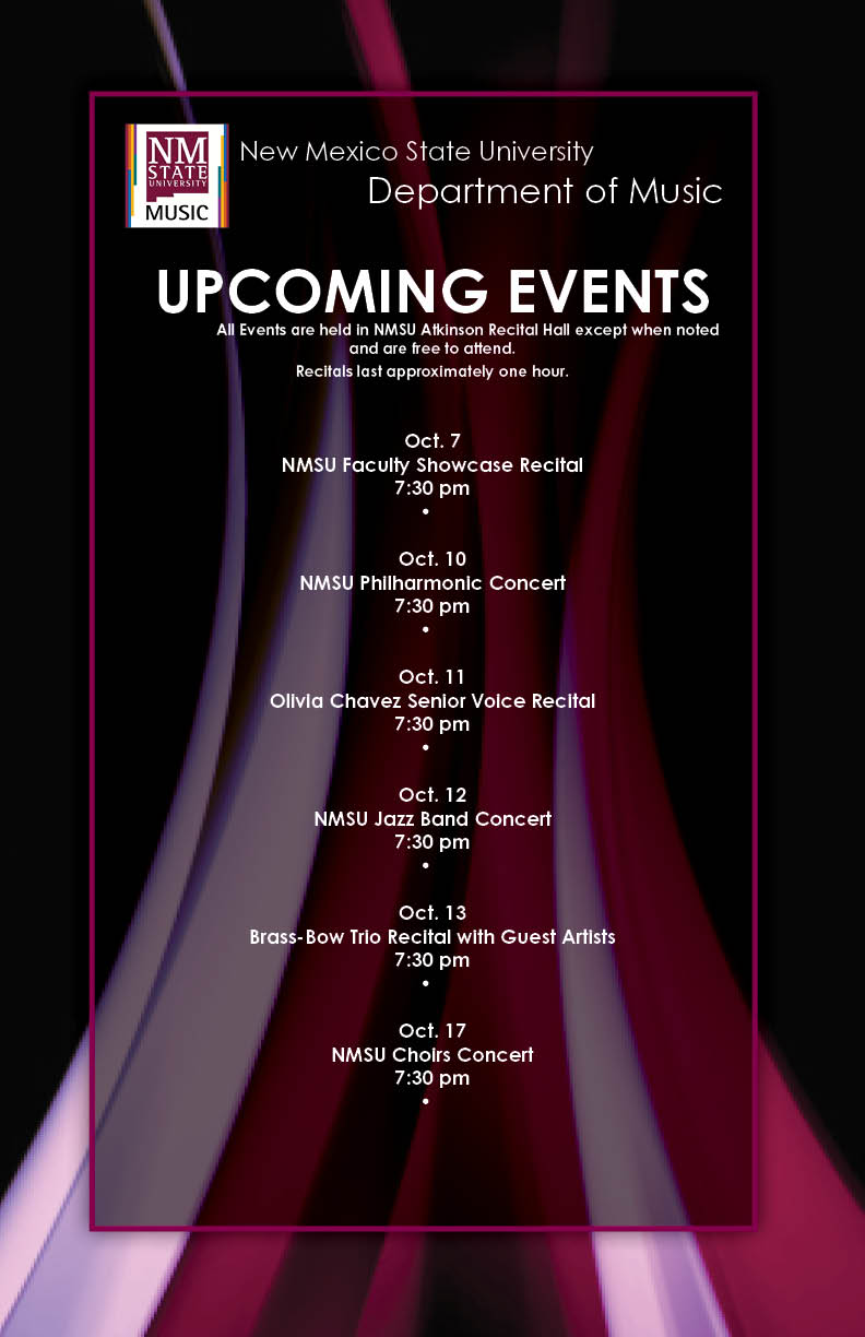 Visit this page for upcoming NMSU Music Department concerts and events and News. Unless otherwise noted, all concerts are free, general admission and take place at Atkinson Recital Hall.